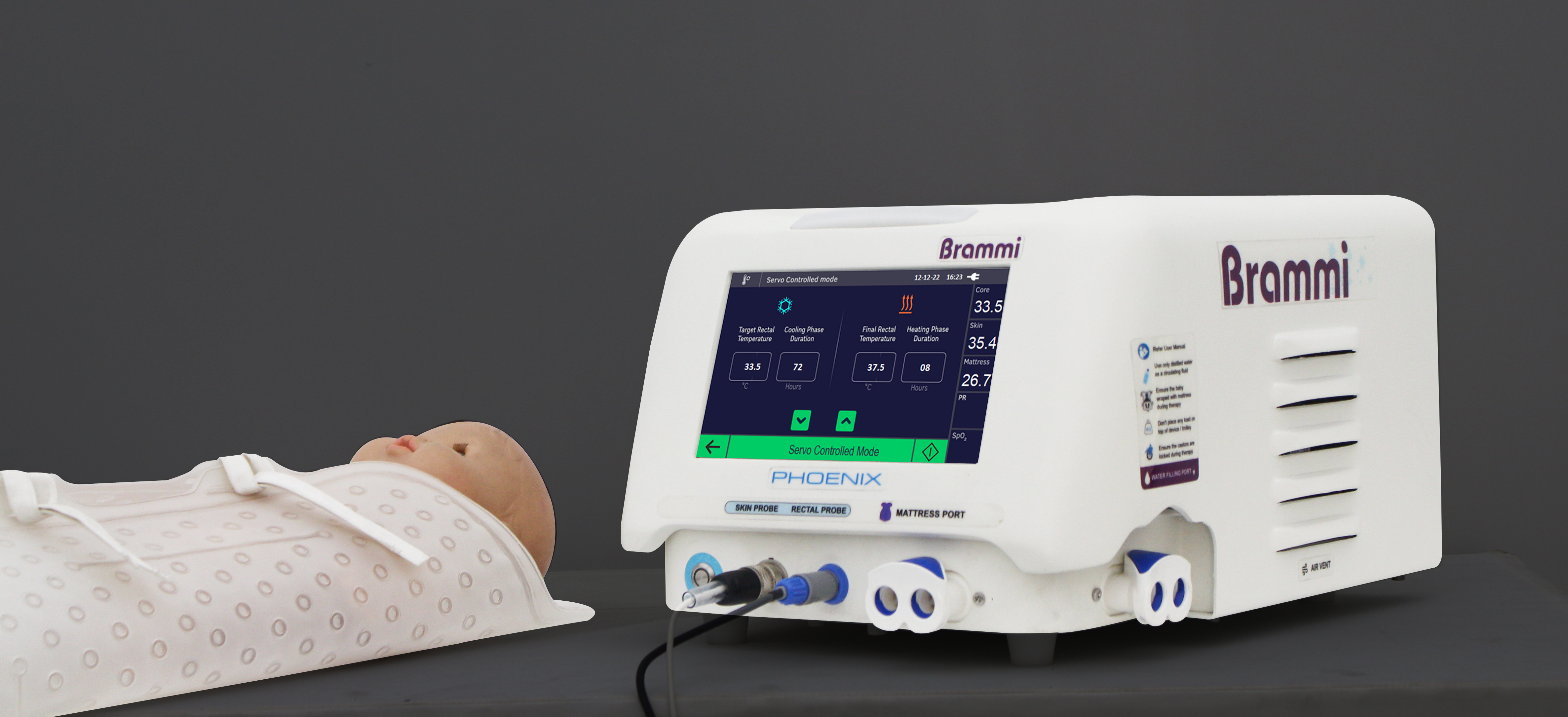 Brammi ใช้บำบัดภาวะอุณหภูมิต่ำในทารกแรกเกิด เป็นอุปกรณ์ควบคุมอุณหภูมิที่มีกลไกพิเศษทั้งทำความเย็นและฟื้นคืนความอบอุ่น พร้อมระบบแจ้งเตือนอัจฉริยะ